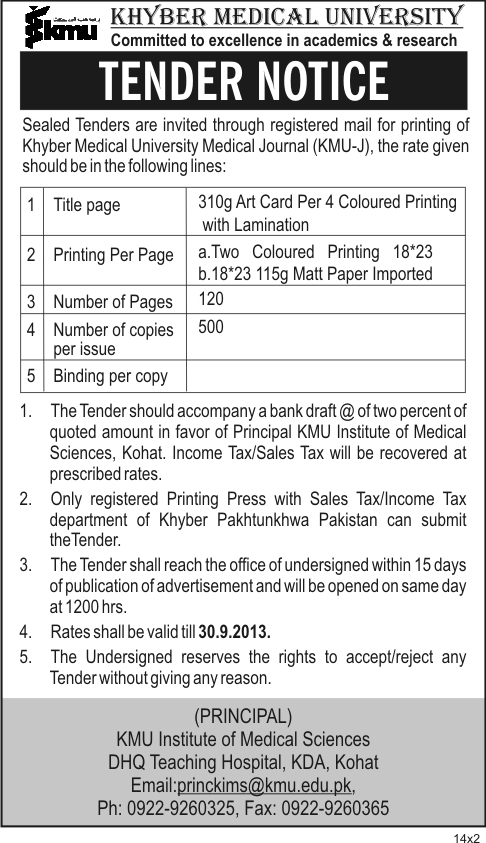Invitation for Bids -- Development of Khyber Medical University, Peshawar for Laboratory Equipment, Furniture and Fixture